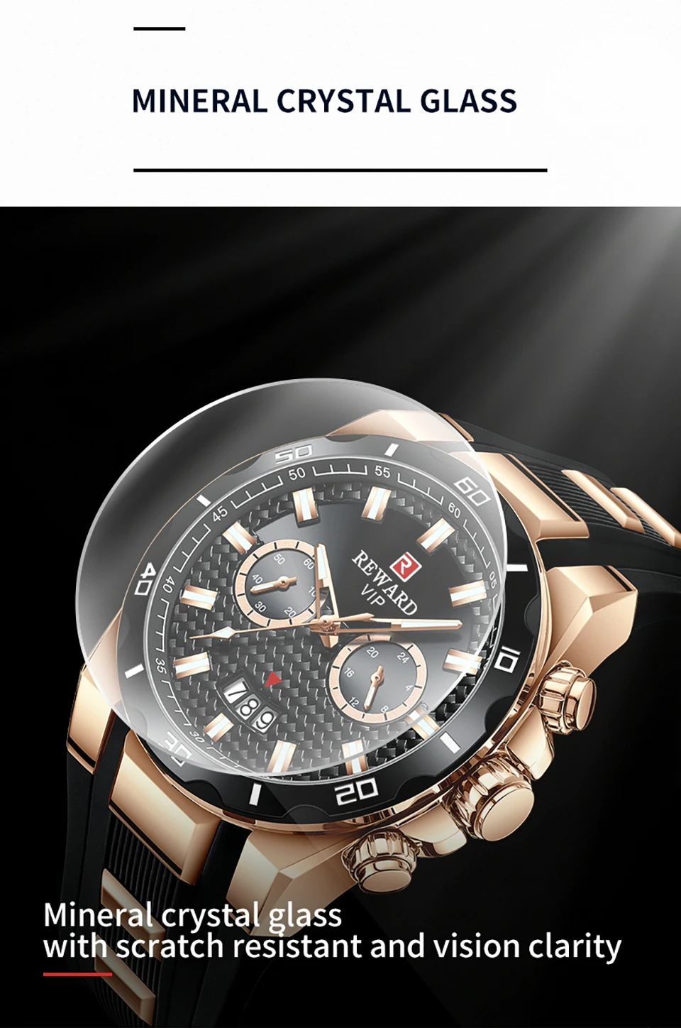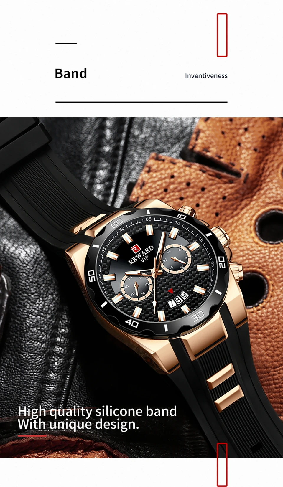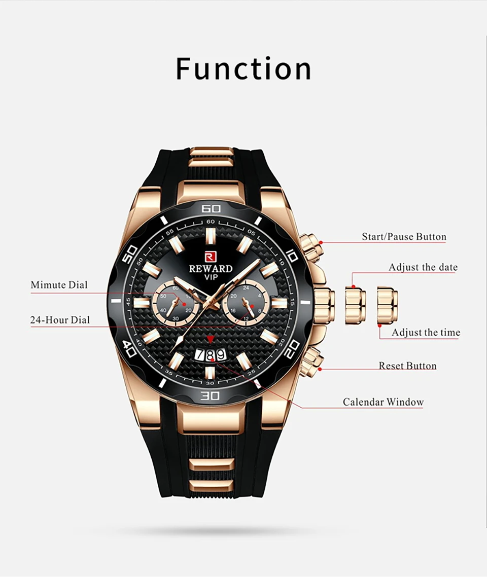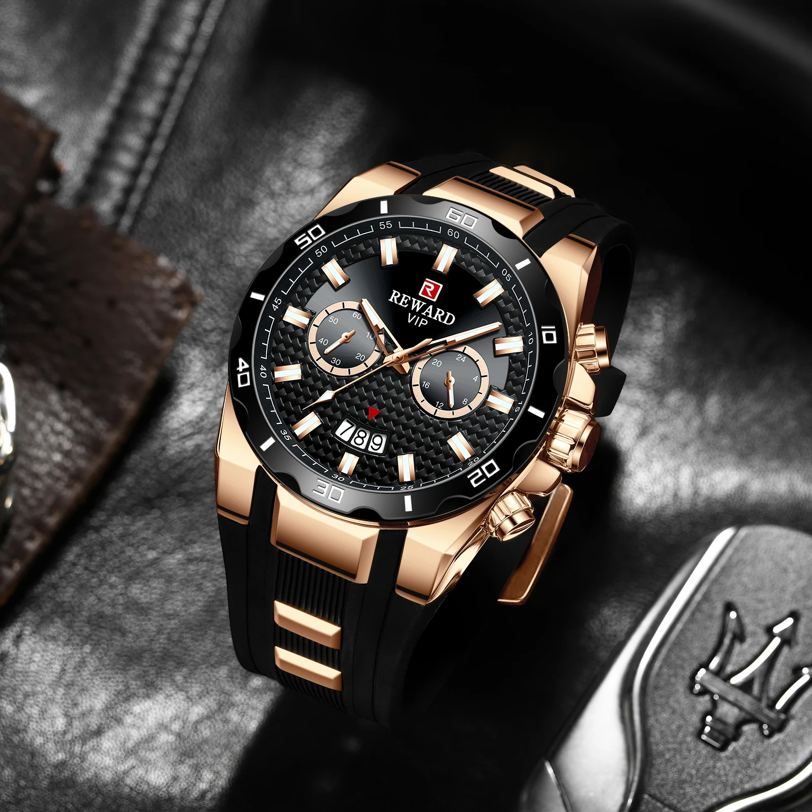 Make a bold statement with this luxury chronograph watch designed for men who value style and strength. Featuring a black dial with rose gold accents, multi-sub-dials, and a durable silicone strap, it combines elegance with performance.